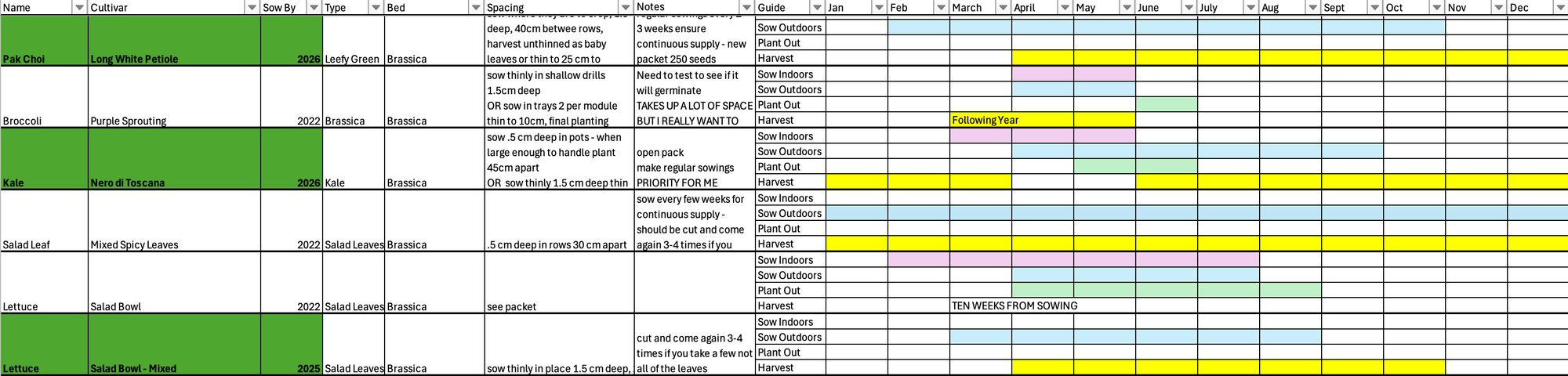 You will see from the plot plan (at the top), and maybe from the spreadsheet snippet (below), that I plan to prepare three large beds which will be run in a 3 bed rotation. Bed A is legumes, Bed B is brassicas, and Bed C roots. What that actually means for the content of those beds is yet to be decided. I am finding it hard to work out what will go in the legumes bed. I know what belongs there in theory, but not what I want to grow and eat. I have also made the decision that these main beds (at least) will be traditional rather than no-dig; at least that is not how I am going to start the plot. Part of this is because I think the initial set-up of no-dig could be costly; perhaps after more reading - and a few months of digging - I will be convinced to change my mind.