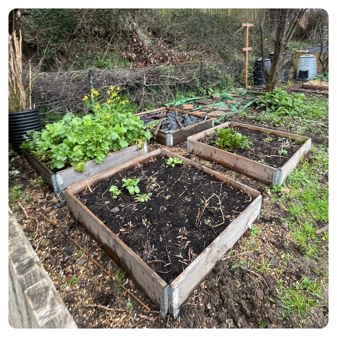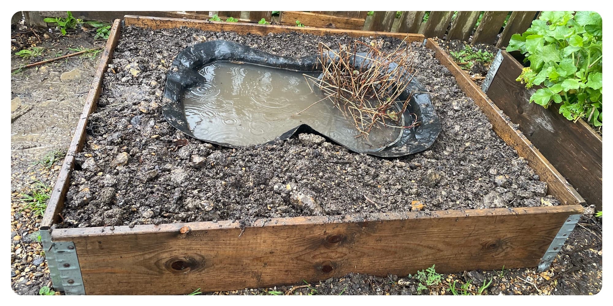 I had decided that I would turn one of the four raised beds into a pond, it is the perfect size for the pre-formed liner that Dad had, and I feel like having it raised a little may make it safer for small visitors. There is a plant too, but I can't tell you what it is as I don't know! We did the project in heavy rain, but the helpers made pretty quick work of it, before filled it with rainwater from the waterbutt, leaving the heavy rain to top it off. The ground wasn't too hard, there is a little layer of gravel that was the base for the previous owners greenhouse, and there were some tree roots, but the never-ending rain of 2026 hasn't caused things to be too sodden, sticky or heavy.